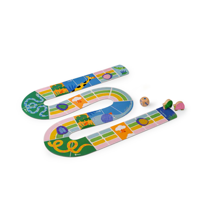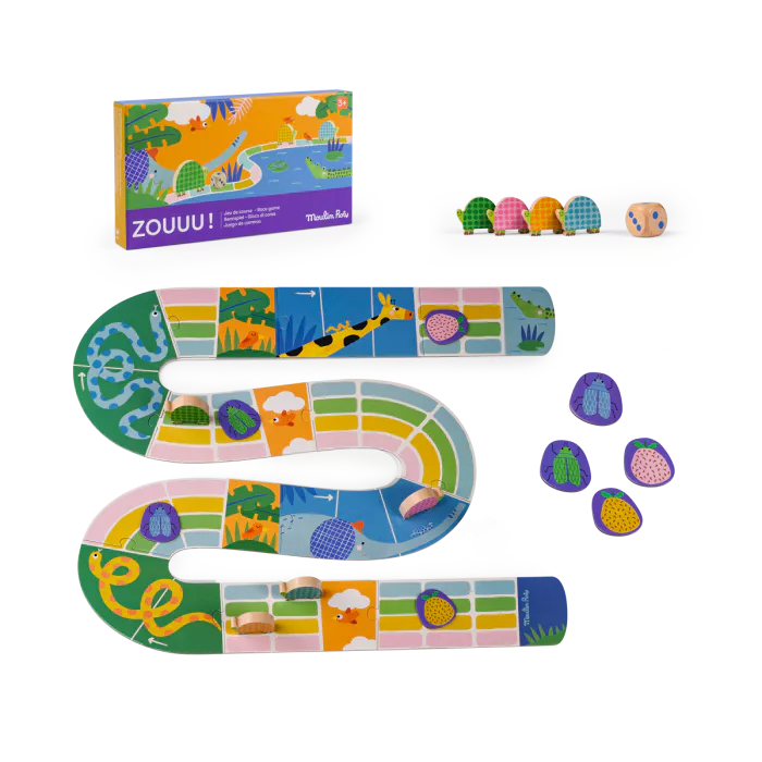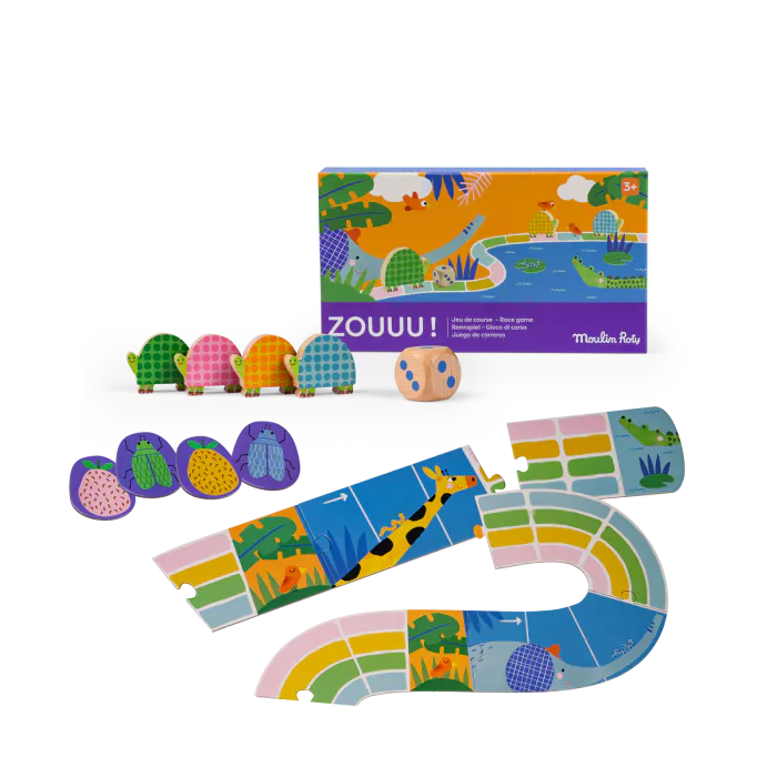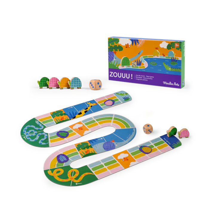 Zouuu, il fait chaud, tous à la mare ! Jeu de course, issu de la collection Les Toupitis. Soyez la première tortue à atteindre la mare pour se baigner avec le crocodile. Mais attention aux jetons pièges sur votre chemin ! De 2 à 4 joueurs. 3 ans et +.