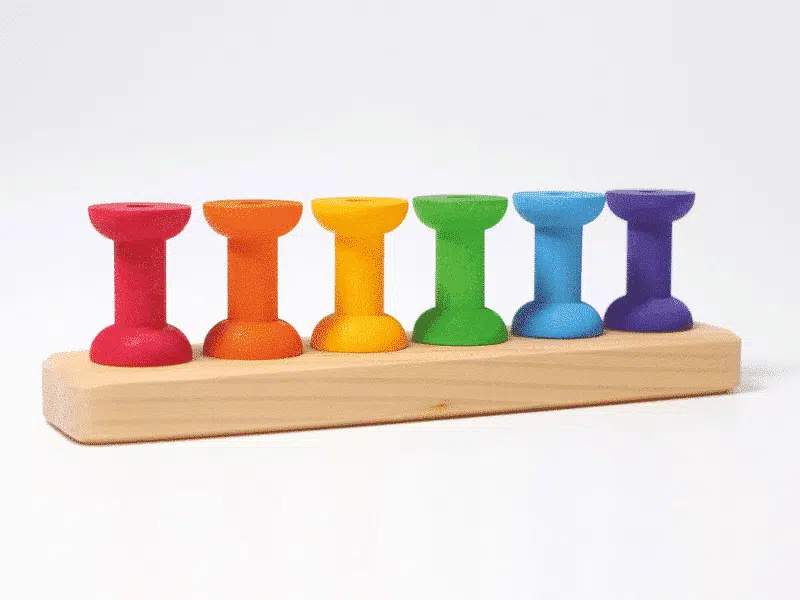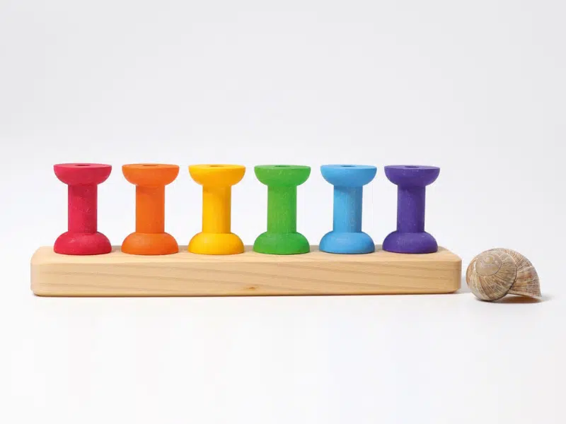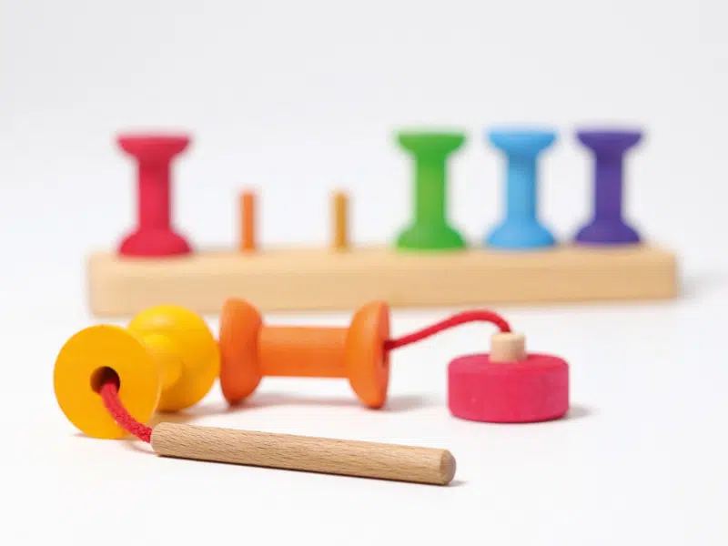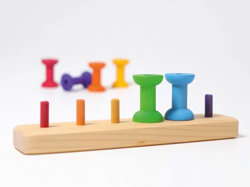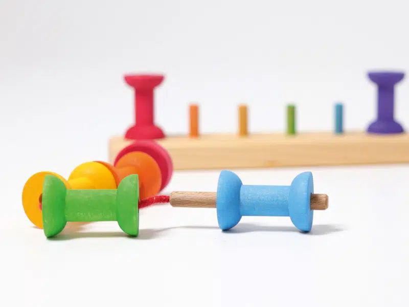 Travaillez la patience, la dextérité et la motricité fine des enfants grâce à ce jeu d’enfilage de petite bobines de Grimm’s! Ils s’amuseront à insérer les petites bobines sur le cordon fourni à cet effet et ressentiront la satisfaction d’avoir réussi tout seuls. Ils pourront associer les bobines en les insérant sur les gougeons assortis en observant leurs couleurs. Les bobines colorées peuvent aussi être utilisées pour empiler simplement, pour construire et aligner. C’est un jeu de manipulation simple qui peut aussi servir pour construire!