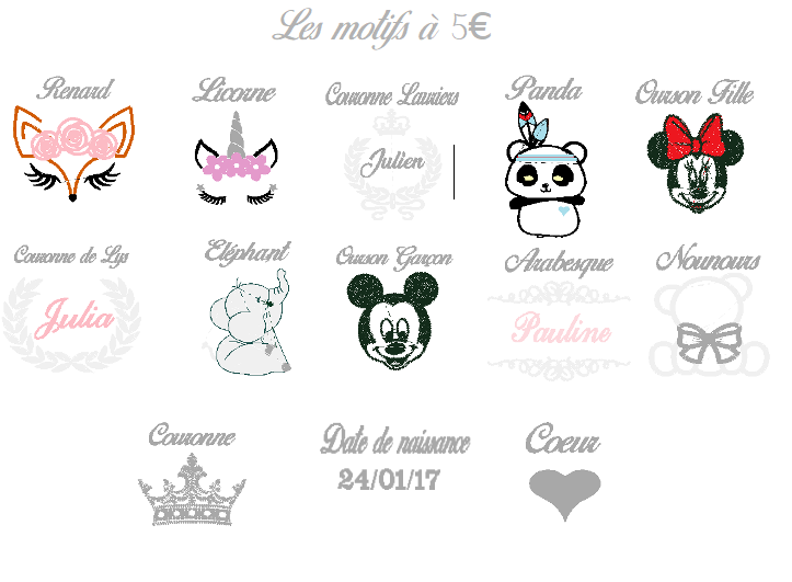 | Couleur de la broderie | Beige, Blanc, Bleu clair, Bleu foncé, Doré, Gris clair, Gris foncé, Noir, Rose clair, Rosé foncé, Rouge, Vert |