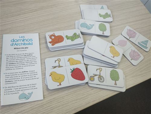 Les dominos d’Archibald est un jeu d’association pour apprendre de manière ludique les chiffres et les couleurs.Le jeu peut se jouer de deux façons : une face en associant les chiffres (de 1 à 6) au nombre d’éléments issus de l’univers d’Archibald, ou l’autre face en combinant des couleurs identiques (bleu, rouge, vert…)Contient 28 dominos et une règle du jeu.Un jeu de domino recto-verso pour apprendre les chiffres et les couleurs !
