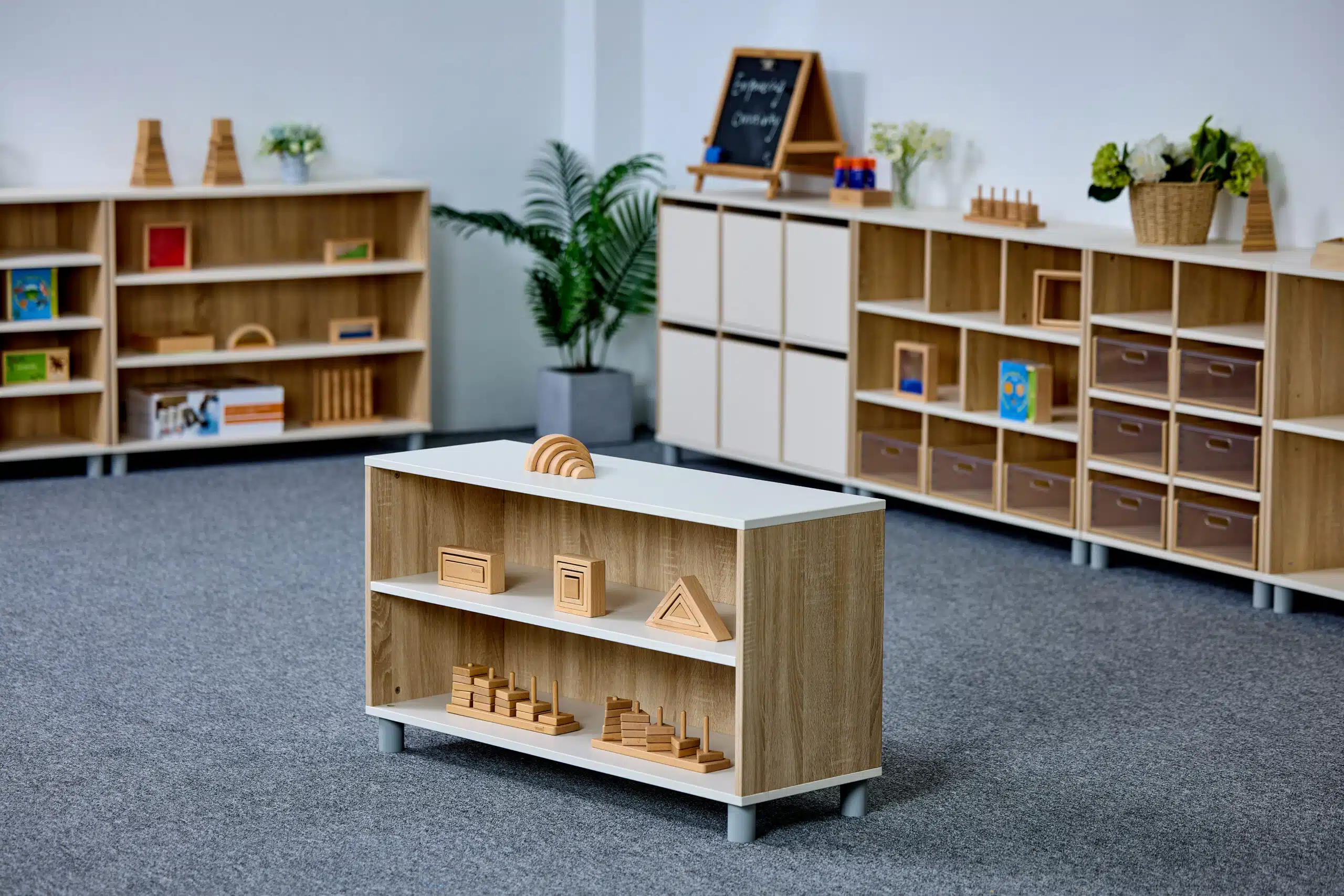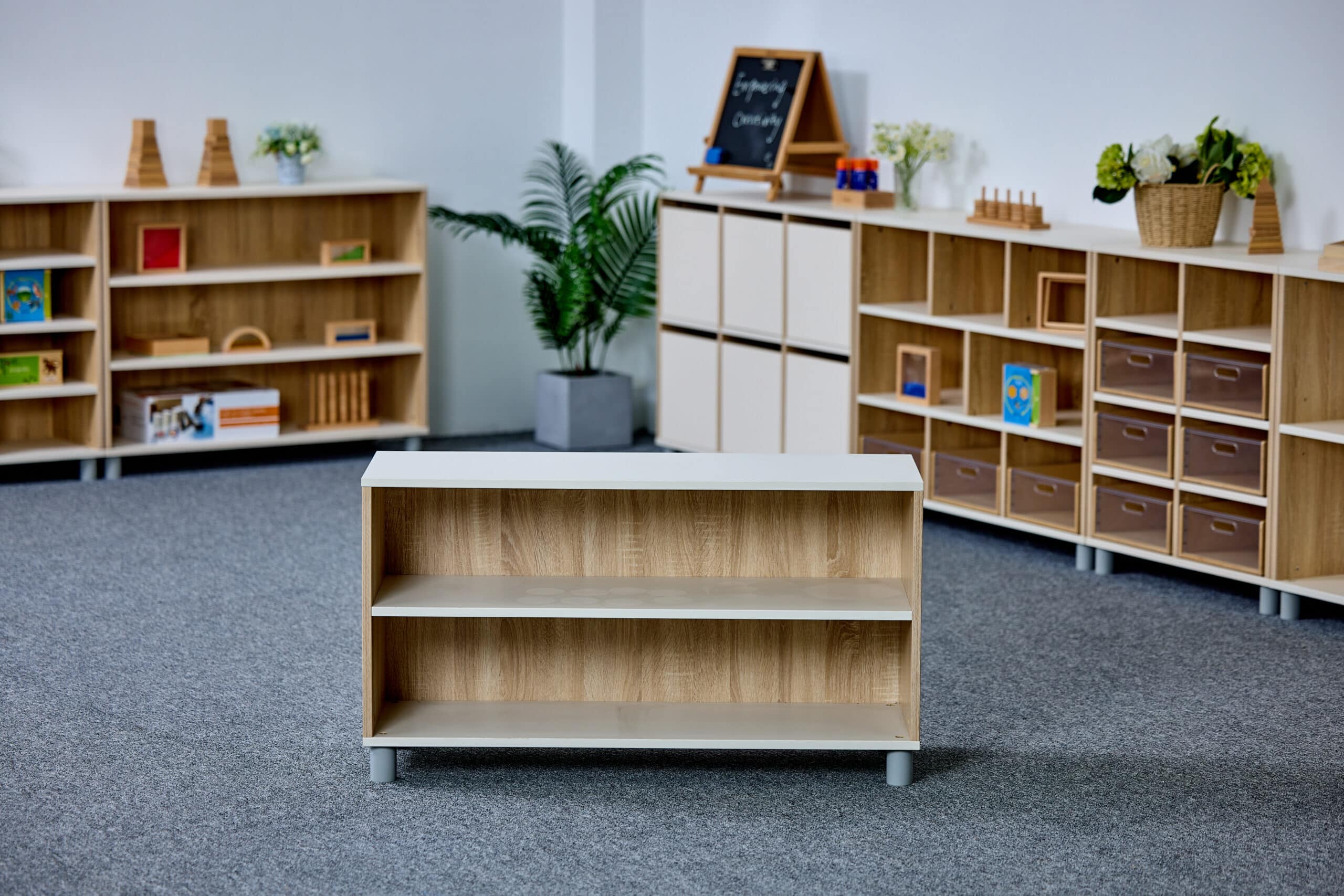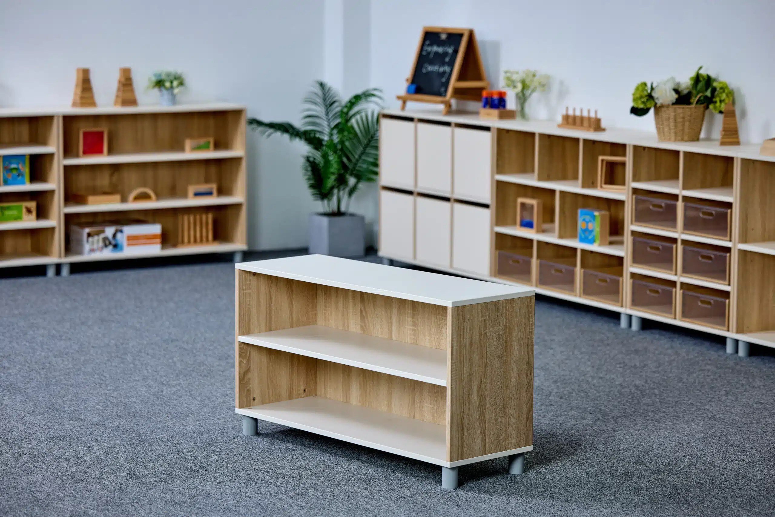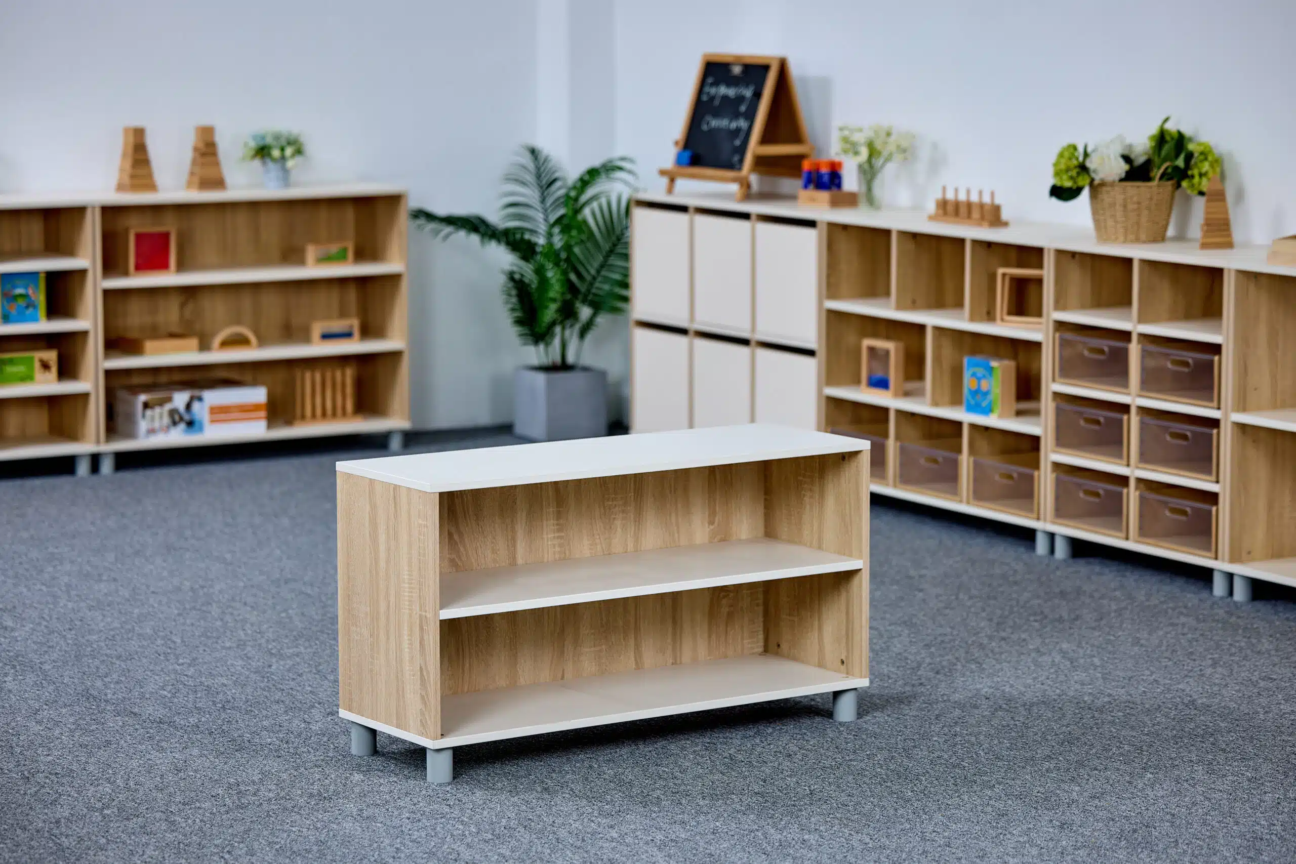 Meuble de rangement à dos fermé à 2 étages idéal pour les CPE, les garderies et les écoles. Il est fait plus large que l’autre Meuble de rangement ouvert à 2 étages. Ce meuble est pensé pour inviter les enfants à explorer, jouer et ranger leur matériel en toute autonomie.