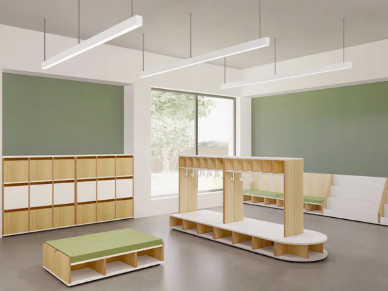 Accessible à hauteur d’enfant, ce module favorise l’autonomie, permettant aux tout-petits de déposer et récupérer leurs effets personnels facilement. Sa construction robuste et fonctionnelle garantit une utilisation durable au quotidien dans les garderies, CPE et écoles.