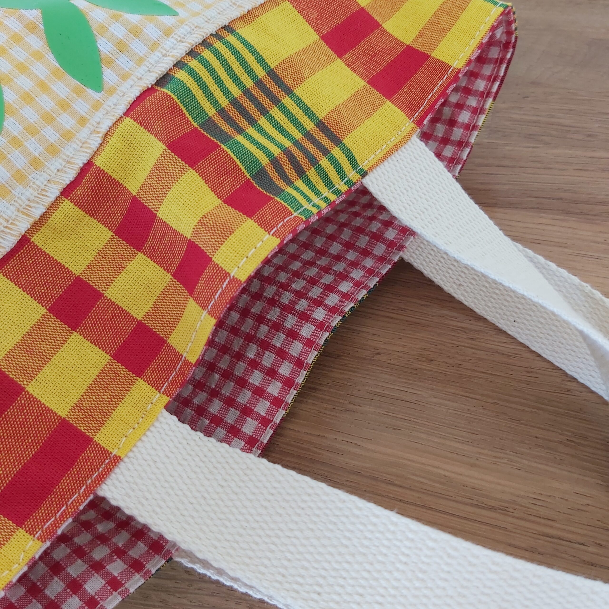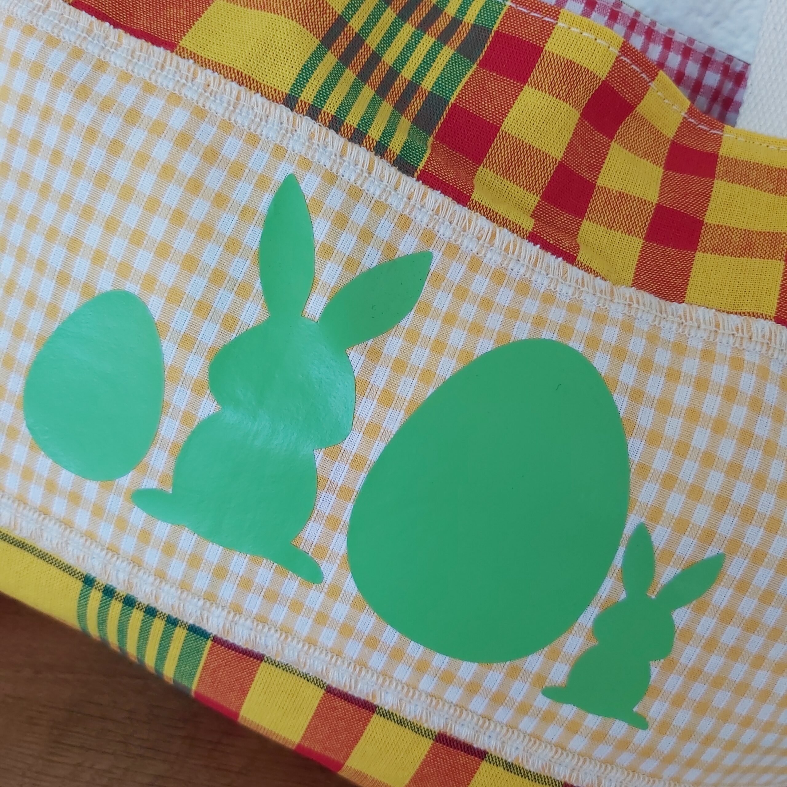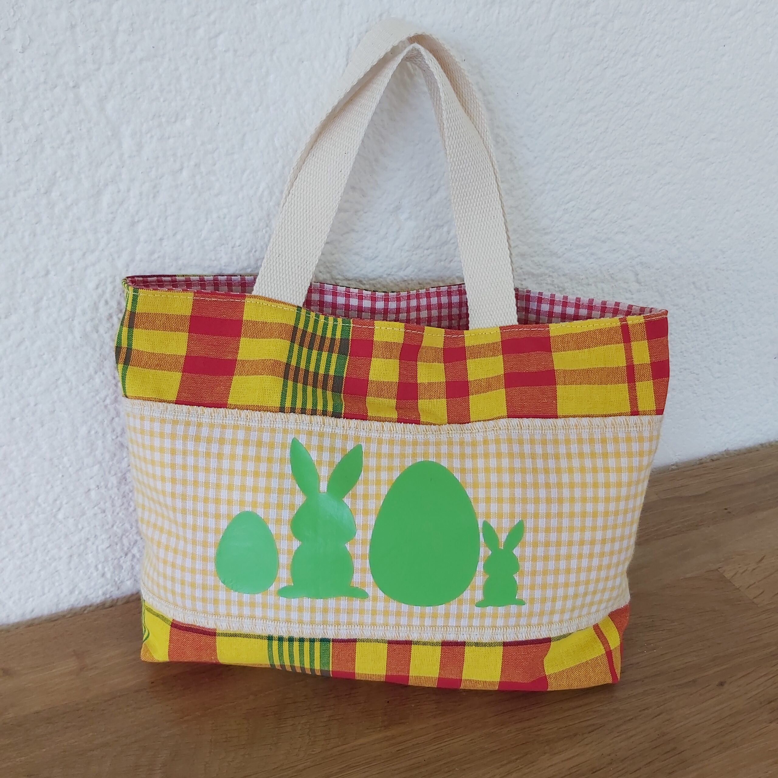 Le secret d’une chasse aux oeufs réussie c’est d’avoir Le bon panier ! Ce joli panier de Pâques est réalisé avec du madras et un vichy assorti. Il est entièrement doublé d’une cotonnade. Flocage de qualité : Flex Cricut. Dimensions : 27 x 21 cm. Lavage 30°. Pas de Javel.