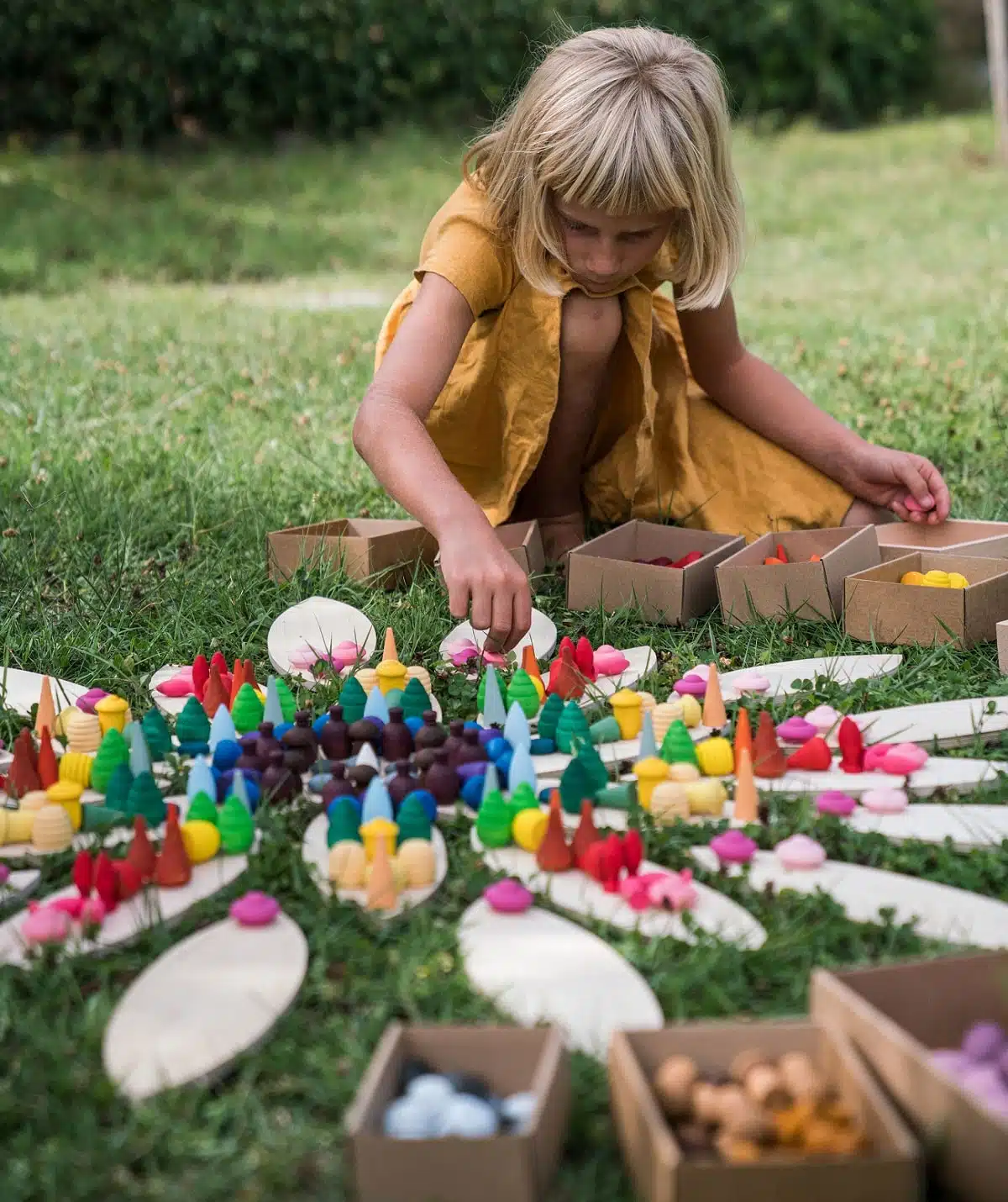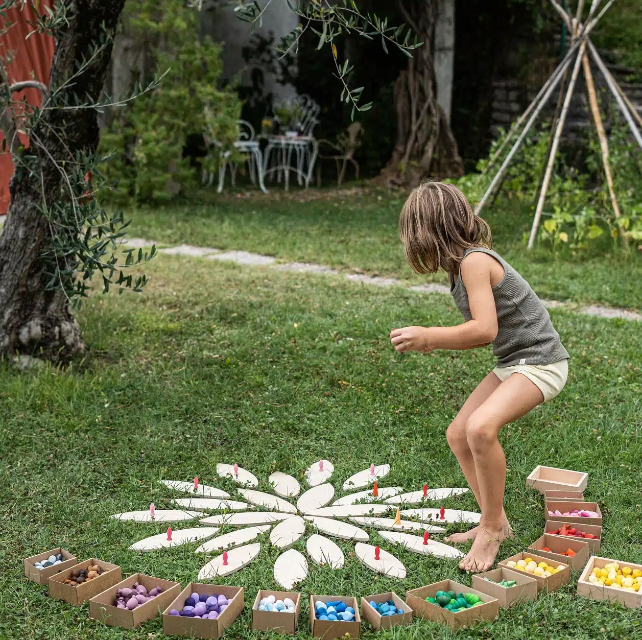 Cette plateforme en bois contient 24 pétales grand format. C’est une plateforme fantastique pour la création de mandalas géants! Il s’agit d’un matériau non structuré parfait qui se prête à différentes activités ludiques et ouvertes. Les pétales peuvent être utilisés comme plateformes pour des jeux de construction libres ou pour des créations semblables à des mandalas. Explorez avec les enfants la symétrie, la constance des motifs et des couleurs et les suites logiques qui sont des concepts directement liés aux mathématiques. Utilisez l’espace, bougez autour de votre création et déplacez-vous pour ajouter des pièces, modifier l’œuvre ou ajuster le positionnement des différents éléments qui la composent. Laissez place à votre imagination, soyez créatifs et mettez vos capacités à profit dans ces œuvres d’art éphémères! Pourquoi ne pas utiliser les pétales en bois en guise d’oreilles de lapin pour un jeu de rôles ou encore comme base pour construire en hauteur. Alignez-les, placez-les comme bon vous semble et ressentez le plaisir de créer librement avec ce matériel polyvalent.