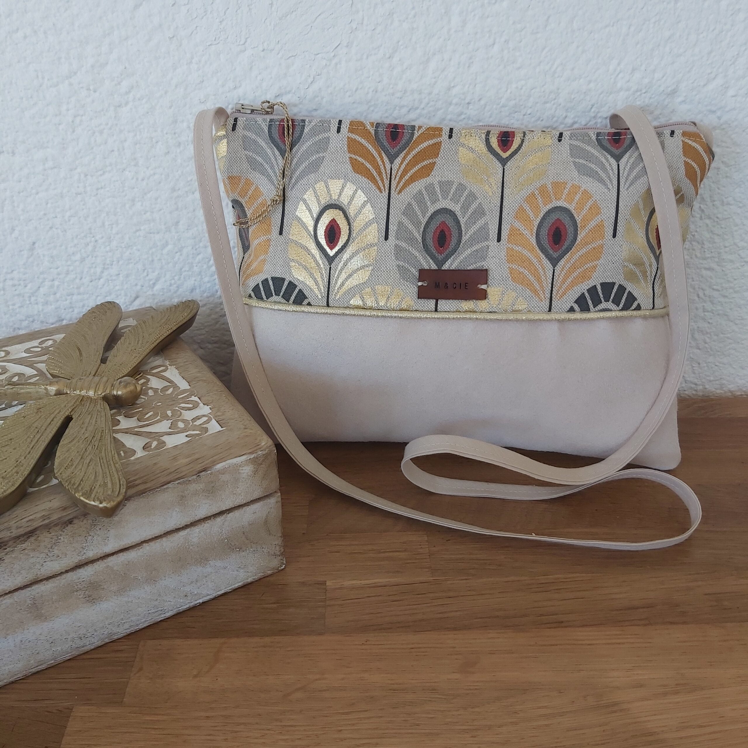 Une bien jolie pochette à bandoulière à porter pour toutes occasions ! Ce bel imprimé associé à la suédine avec la pose du passepoil doré entre les deux matières. Entièrement doublée d’une cotonnade avec fermeture zippée. Lavage à la main. Pas de sèche linge.
