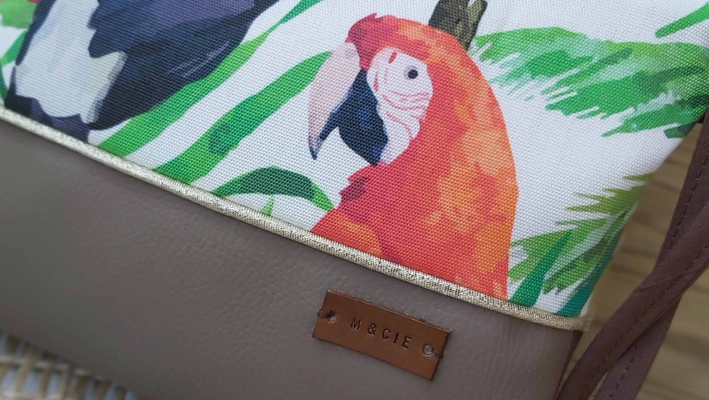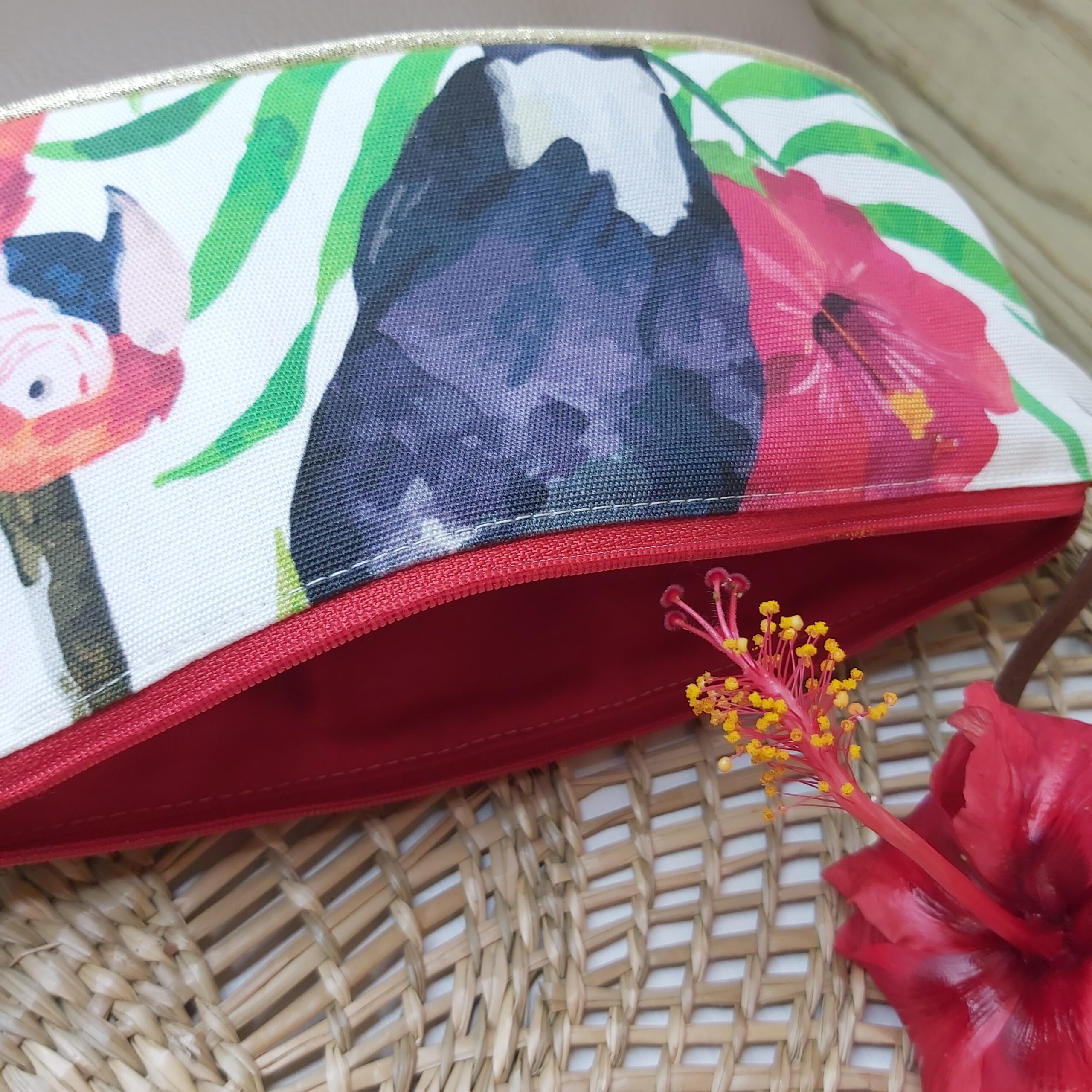 Une bien jolie pochette à bandoulière à porter pour toutes occasions ! Ce bel imprimé aux couleurs tropicales associé au simili cuir avec la pose du passepoil doré entre les deux matières. Entièrement doublée d’une cotonnade avec fermeture zippée. Lavage à la main. Pas de sèche linge.