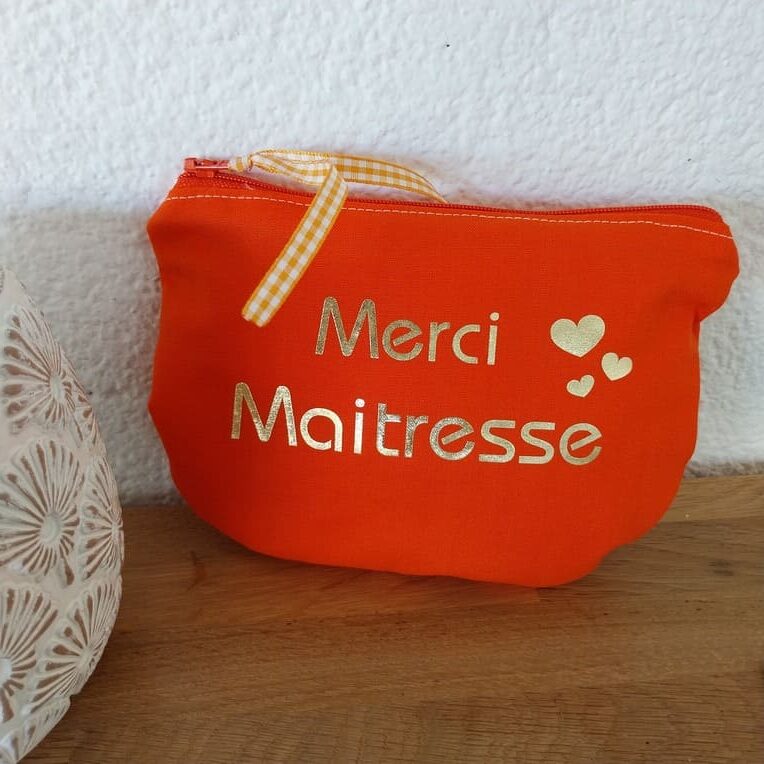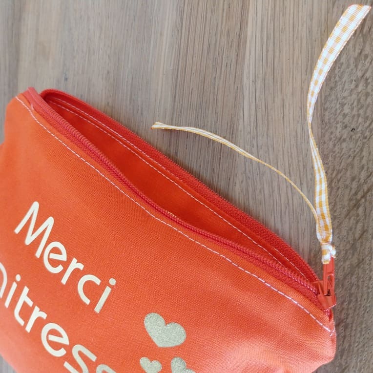 La fin de l’année scolaire approche ? Pensez au super petit cadeau pour la maîtresse ! Pochette maîtresse réalisée avec une cotonnade orange. Entièrement doublée avec fermeture zippée et son petit ruban. Dim : 17x13cm. Lavage 30°. pas de sèche linge. Pas de Javel.