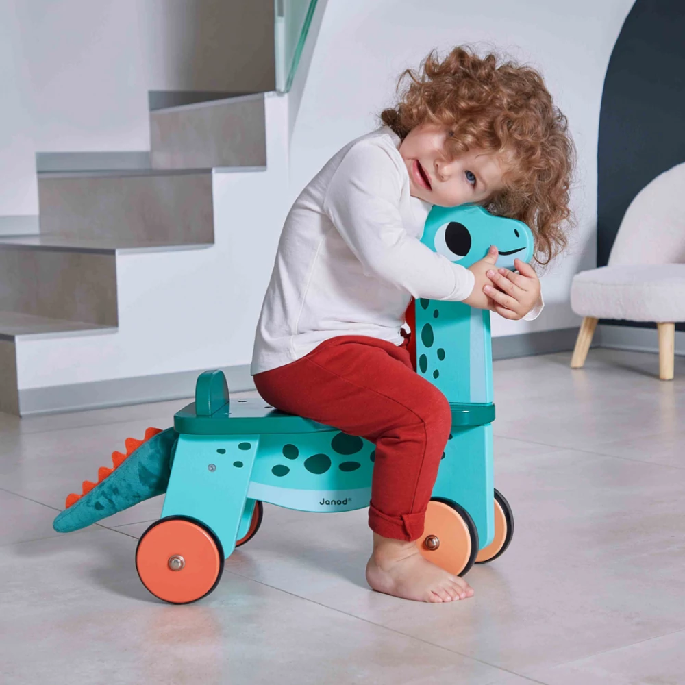 Faites place ! Notre porteur diplodocus entre en scène ! Il va sans dire que tous les enfants seront fiers de se déplacer à dos de dinosaure dans la maison et dehors ! On adore les couleurs bleues rehaussées de pointes orangées de notre Portosaurus aux yeux tout ronds ! Son large sourire donne envie de partir pour la plus belle des balades ! Dès 12 mois, proposez à votre enfant de développer sa motricité en utilisant un porteur en bois sur 4 roues très stables. Les 2 roues de l’avant bougent avec la tête du dino quand les enfants…