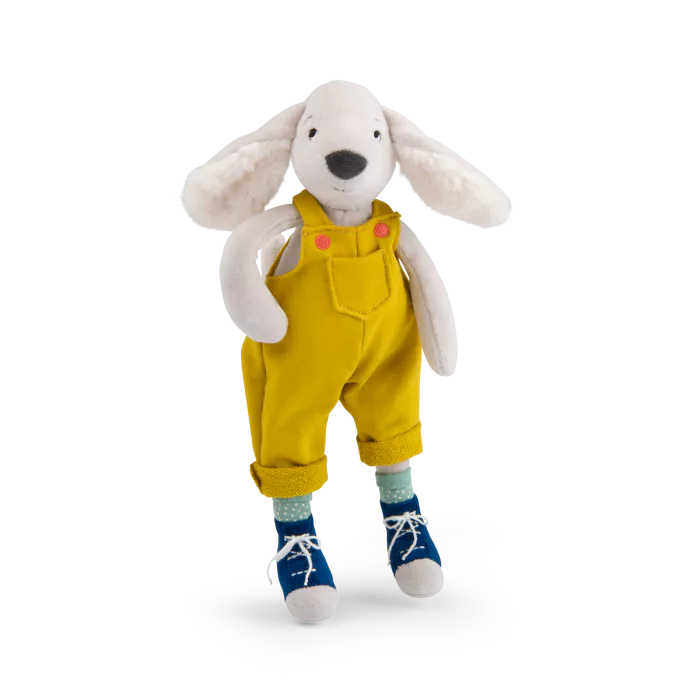 Pilou le malicieux dans sa petite salopette jaune et avec ses grandes oreilles toutes douces, ne demande qu’à faire des câlins !