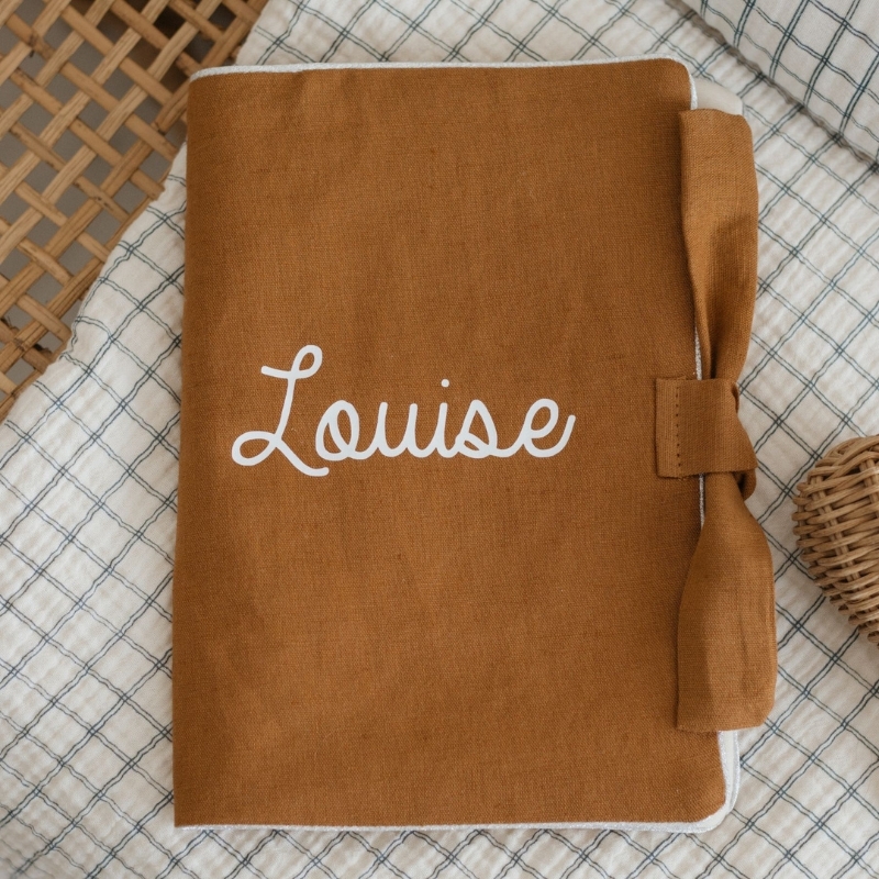Un très joli carnet de santé à personnaliser en gaze de coton doublé avec de la toile de coton. Il est personnalisable à souhait au prénom de votre enfant. Pour choisir votre personnalisation, faites défiler les photos jusqu’à trouver l’image avec les couleurs et les polices d’écritures disponibles. Juste en dessous, choisissez le numéro correspondant à la couleur et l’écriture.