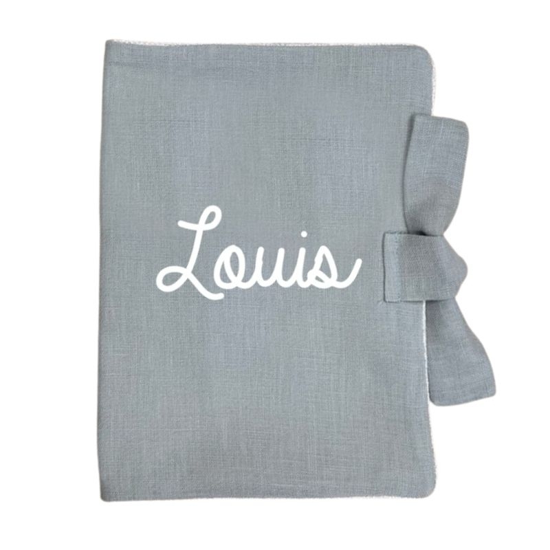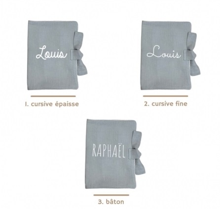 Un très joli carnet de santé à personnaliser en gaze de coton doublé avec de la toile de coton. Il est personnalisable à souhait au prénom de votre enfant. Pour choisir votre personnalisation, faites défiler les photos jusqu’à trouver l’image avec les couleurs et les polices d’écritures disponibles. Juste en dessous, choisissez le numéro correspondant à la couleur et l’écriture.