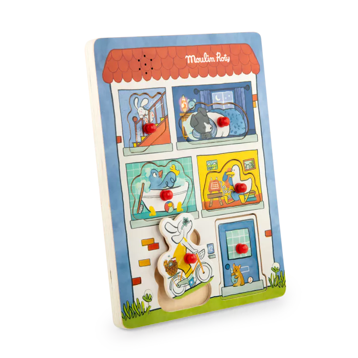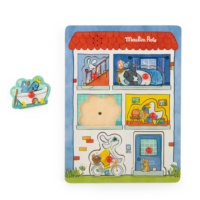 Puzzle sonore pour s’éveiller à la musique de manière ludique. Replace les 6 pièces en bois qui composent la maison de Puce & Pilou en y découvrant les sons du quotidien : sonnette, téléphone… Permet aussi d’appréhender les formes et les couleurs.