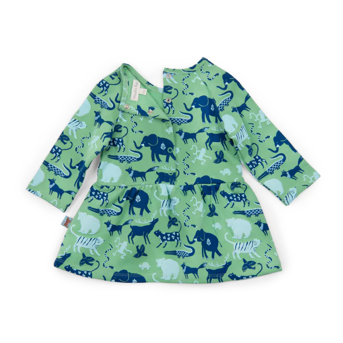 Robe en molleton gratté et son imprimé animaux en all over. Coupe froncée à la taille et bas légèrement évasé. Ouverture par bouton pression dans le dos. Chez Moulin Roty, les chaussettes sont fabriquées en France, les vêtements au Portugal et les mailles en Turquie. Pour une qualité si précieuse à la marque.