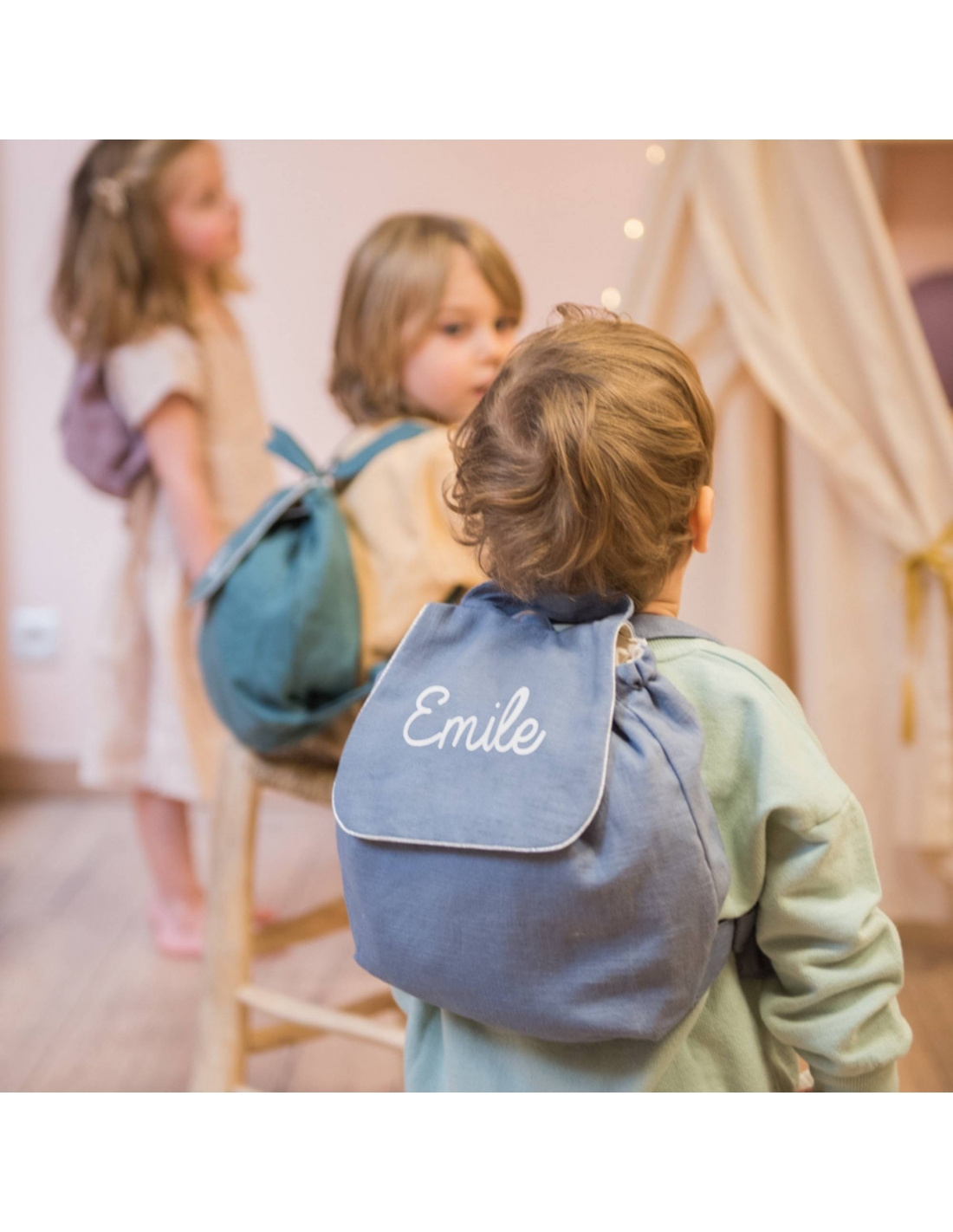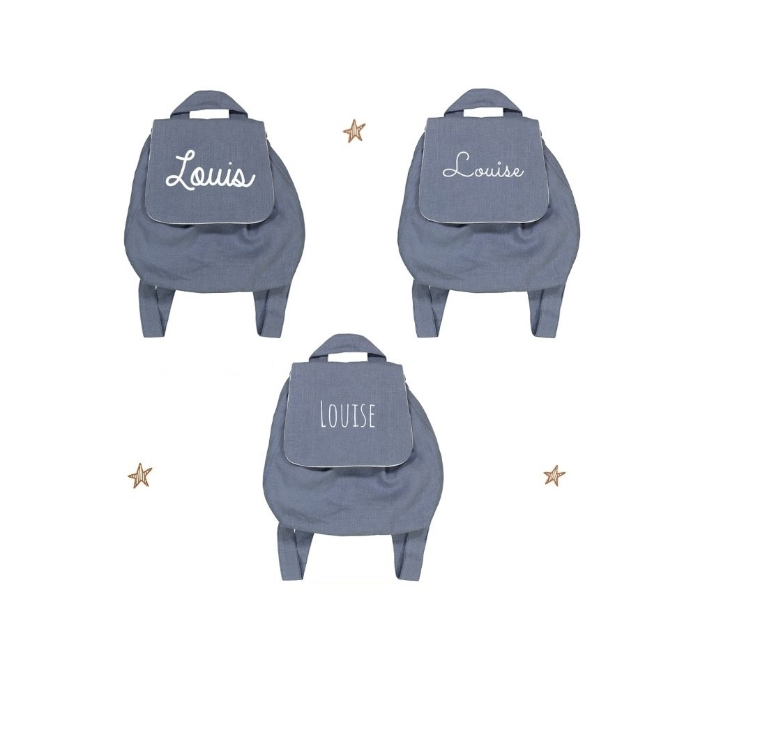 Un très joli sac à dos personnalisable dans lequel on peut transporter un goûter, des affaires de rechanges, une tétine ou un doudou. Pour choisir votre personnalisation, faites défiler les photos jusqu’à trouver l’image avec les couleurs et les polices d’écritures disponibles. Juste en dessous, choisissez le numéro correspondant à la couleur et à l’écriture choisies.