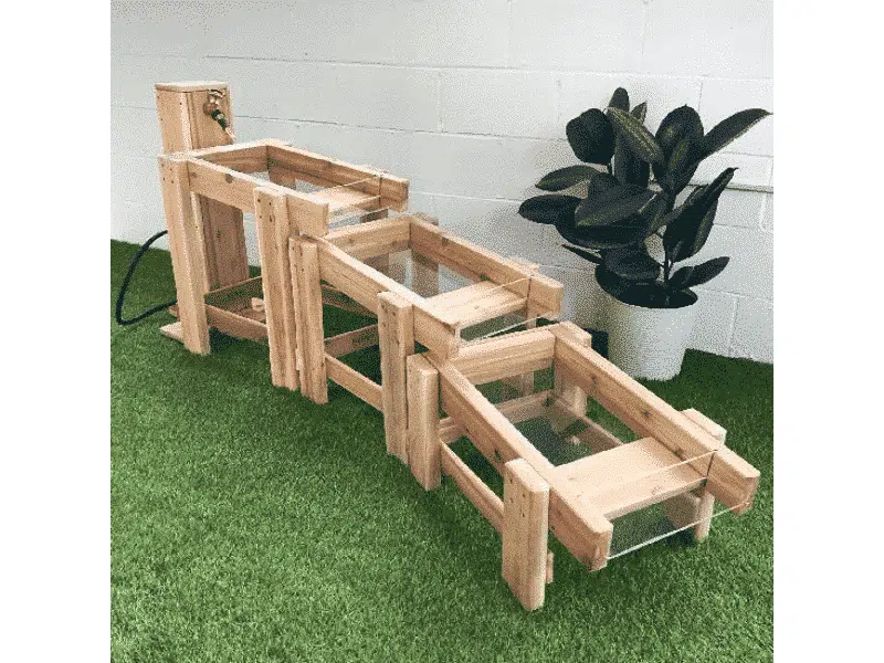 Chaque table est équipée d’une barrière amovible permettant à chaque bassin de se remplir d’eau puis de se libérer pour créer une cascade par gravité. Les dimensions généreuses de chaque niveau encouragent les jeux en groupe. La table supérieure mesure 61 cm de haut et la table inférieure 30 cm de haut.