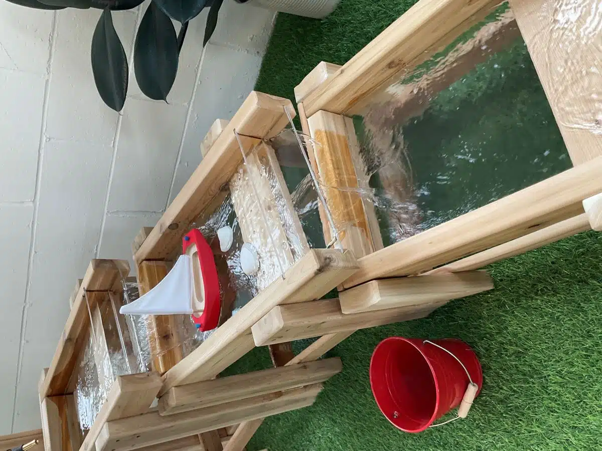 Les fontaines à eau fonctionnent parfaitement avec des arrosoirs pour déclencher le jeu en cascade. Il est également possible d’ajouter un Distributeur d’eau – Just Playing | Les jouets Ciboulot pour une fontaine raccordée à un tuyau d’arrosage.