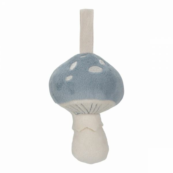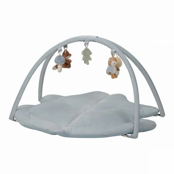 Le tapis bleu possède 2 arches avec cinq peluches différentes : renard, hibou, champignons jaune et bleu et feuille idéal pour le développement sensoriel.