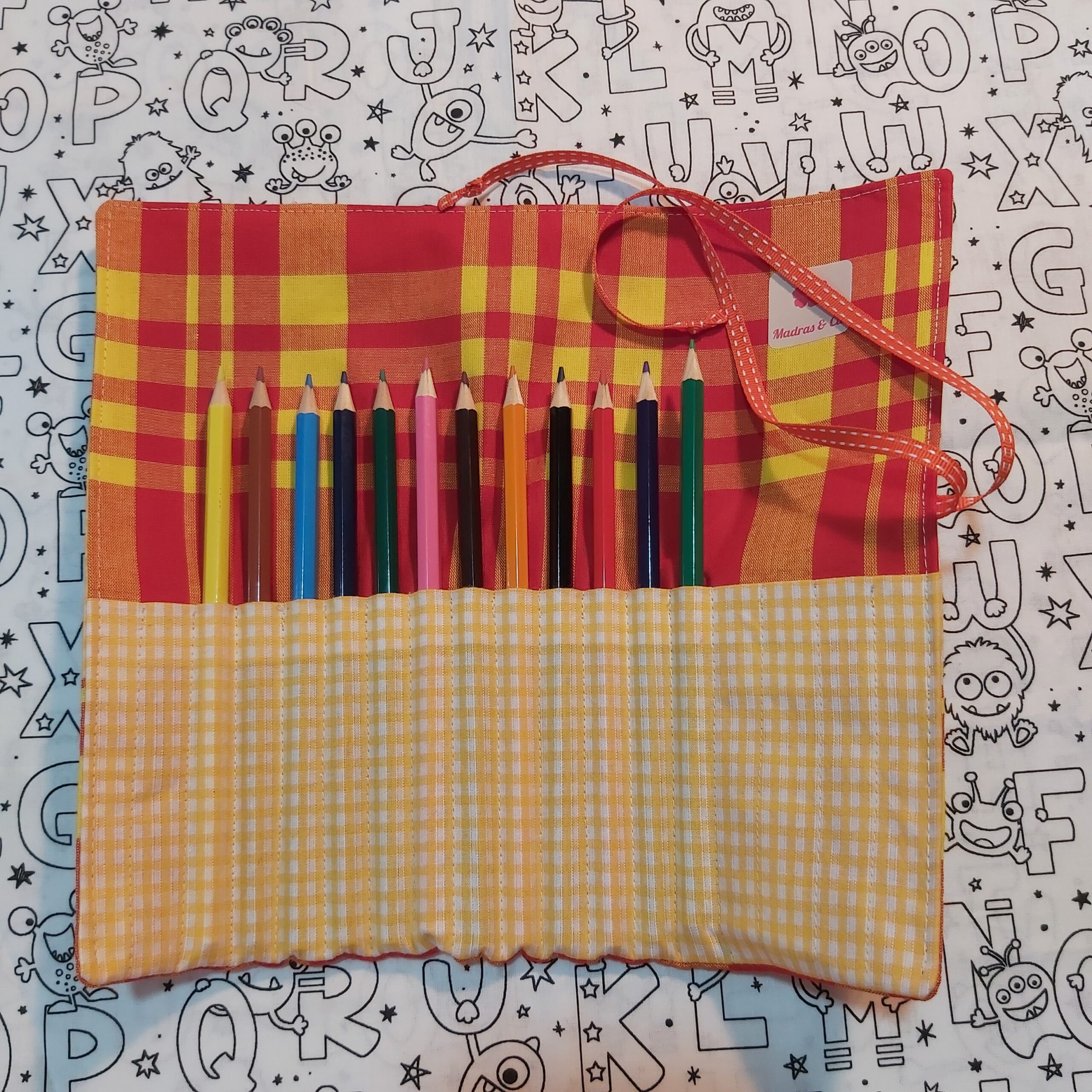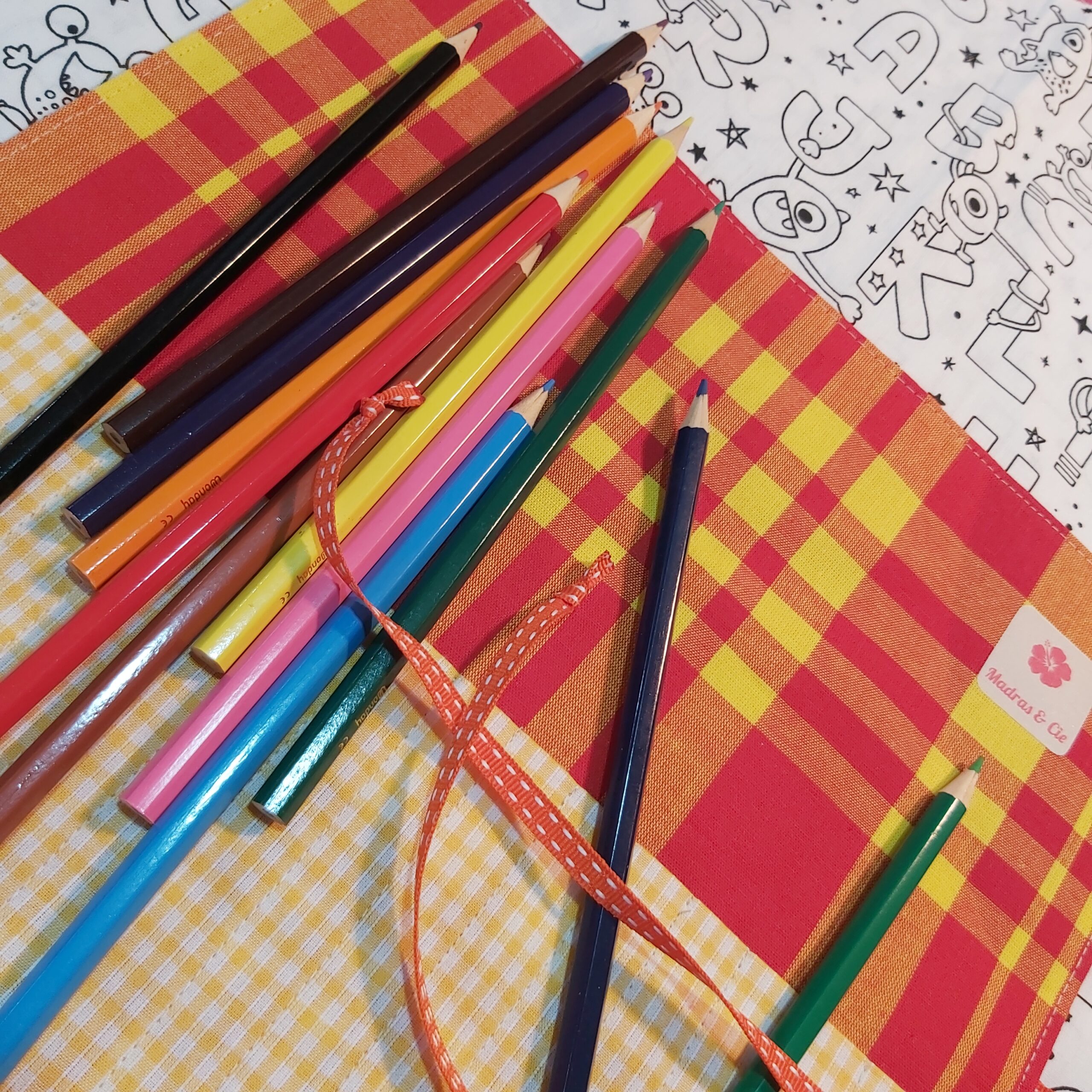 Maline, cette pochette est idéale pour ranger ses crayons ! Trousse roulée en tissus madras et vichy assortis. Chaque crayon a sa place. Se roule pour se fermer à l’aide du ruban. Vendue avec 12 crayons de couleur et un crayon de bois. Dimensions : trousse ouverte : 28 x 24 cm