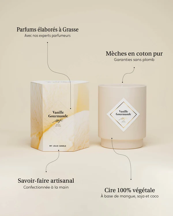Ingrédients : Cire naturelle de soja, mangue et coco. Mèche en coton pur, tressée artisanalement. Un parfum de qualité, élaboré à Grasse. Des contenants en verre recyclé